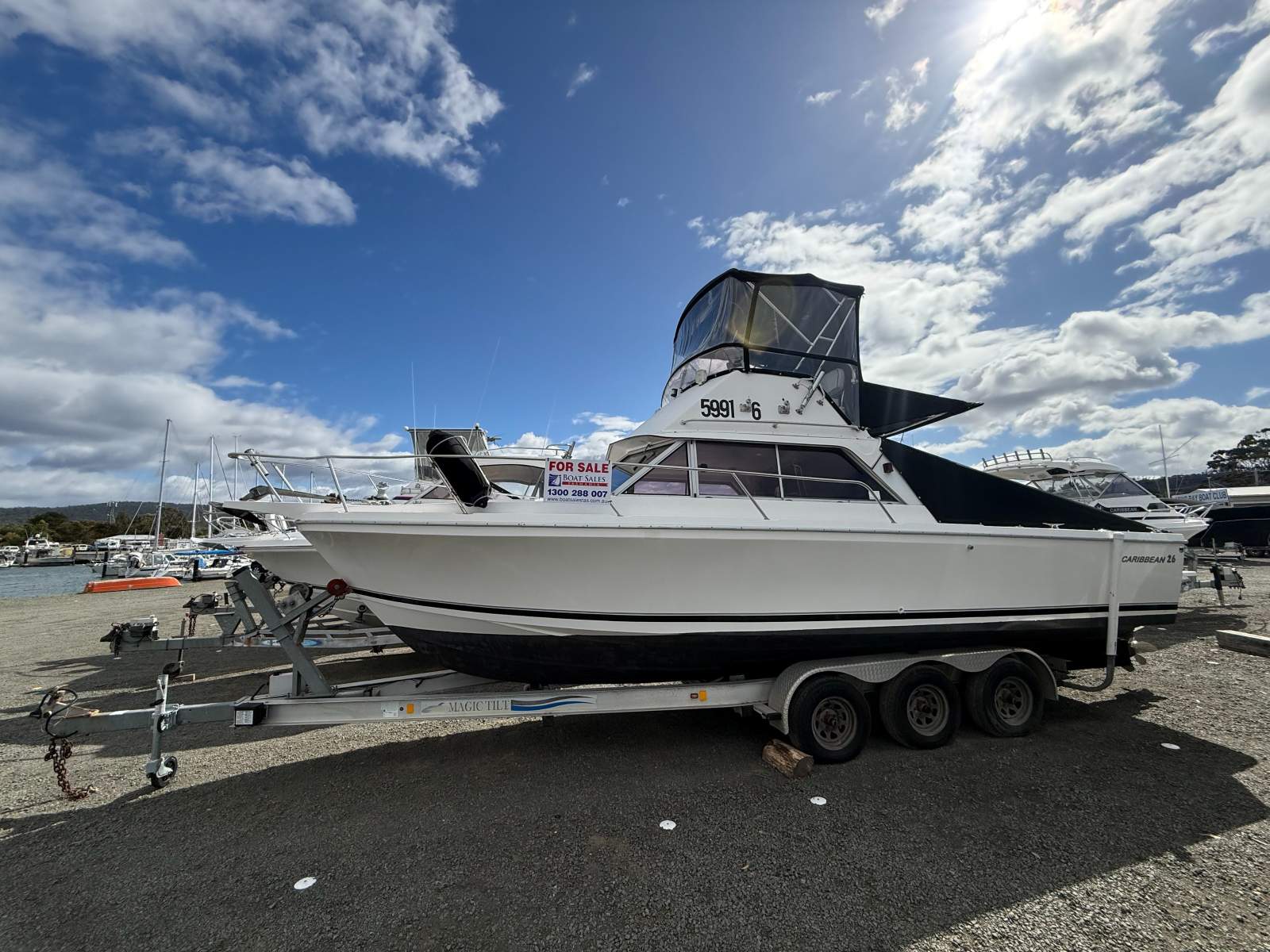 The Magic Tilt tri-axle trailer with electric brakes and hull guides (to make easy work of launching and retrieving) and near new tyres is INCLUDED.